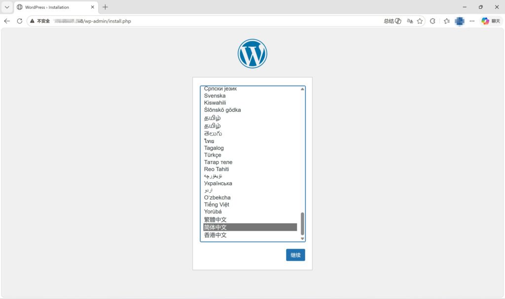 • 看到 WordPress 著名的“五分钟安装”界面,就说明成功了!