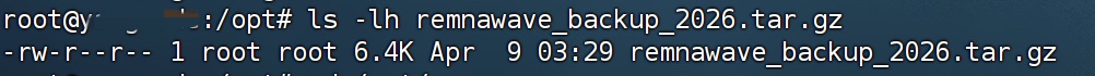 -rw-r--r-- 1 root root 6.4K Apr 9 03:29 remnawave_backup_2026.tar.gz