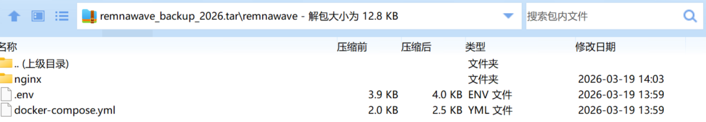 确保你还在 /opt/remnawave 目录下,执行以下命令将整个项目(包括配置、数据库和缓存数据)打包成一个压缩文件: